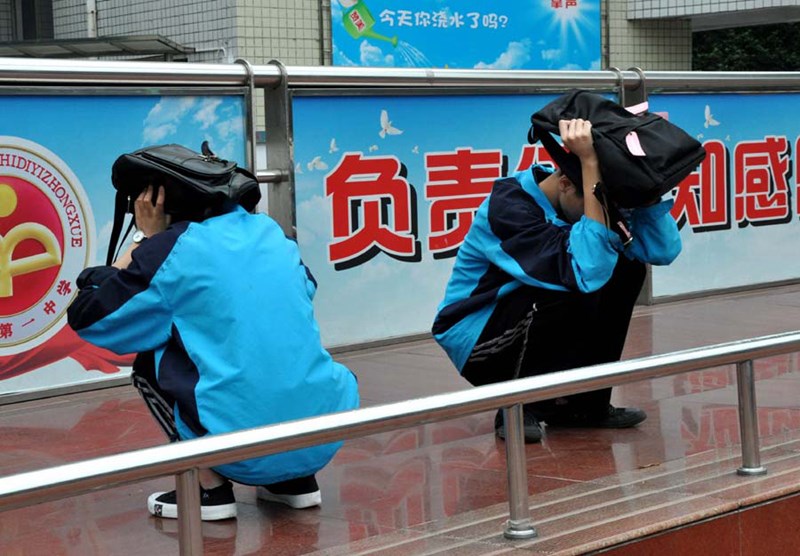 聽(tīng)到地震警報(bào)聲,學(xué)生用所學(xué)到的防災(zāi)減災(zāi)知識(shí)進(jìn)行自我保護(hù)