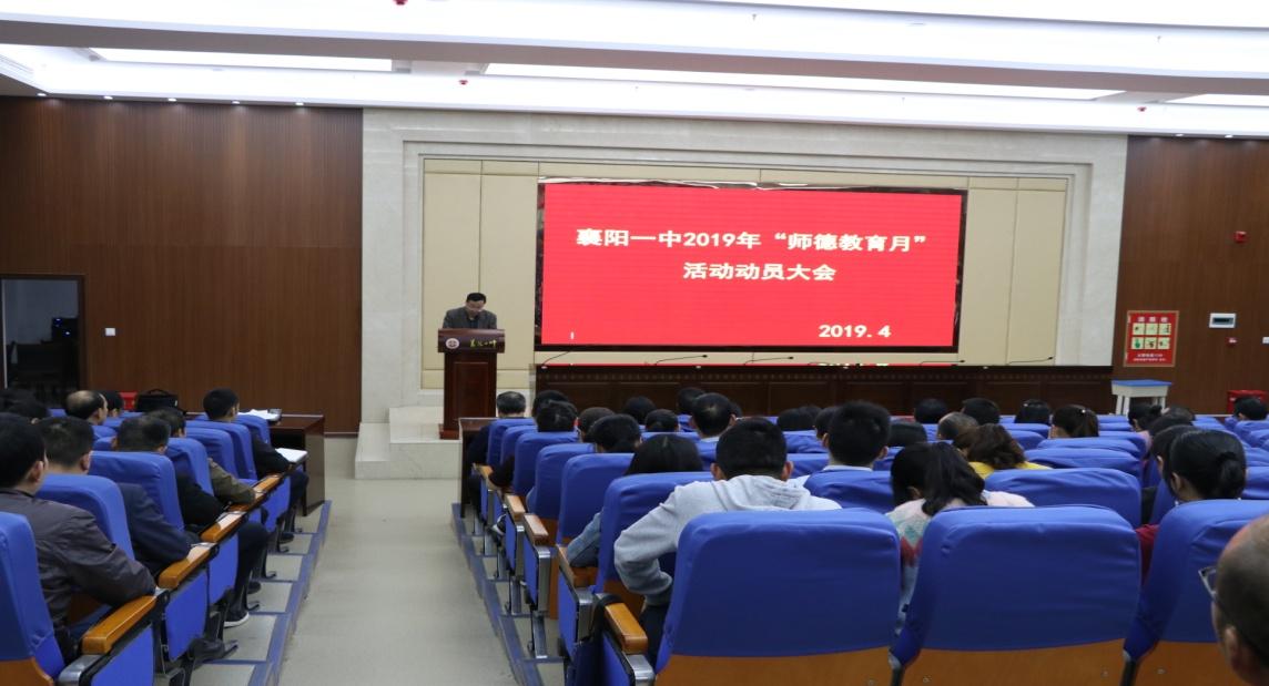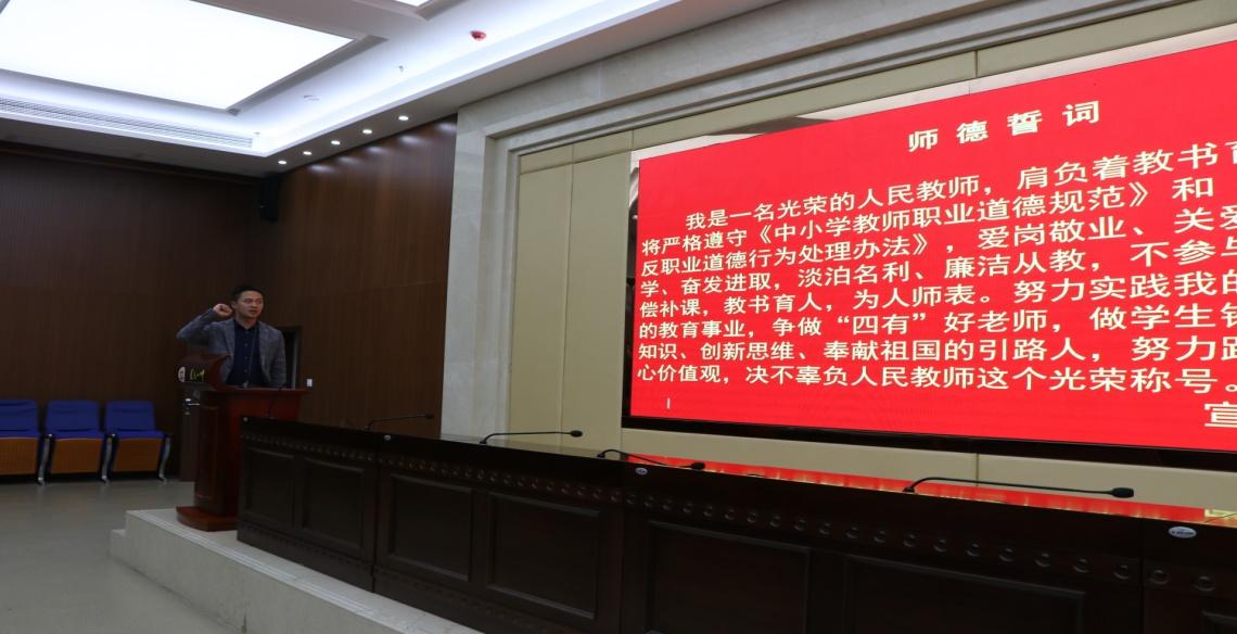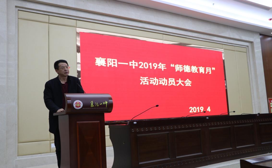 為進(jìn)一步加強(qiáng)我校師德師風(fēng)建設(shè),提高教師的職業(yè)道德修養(yǎng),強(qiáng)化教師文明從教、廉潔從教、規(guī)范從教的職業(yè)意識,切實(shí)轉(zhuǎn)變工作作風(fēng),提高教育教學(xué)質(zhì)量,提升教師隊(duì)伍整體素質(zhì)。2019年4月16日下午,學(xué)校全體教職工在學(xué)術(shù)報(bào)告廳隆重召開師德教育月活動動員大會。大會由學(xué)校黨書記李大強(qiáng)同志主持,副校長李傳緒同志宣讀了《襄陽市第一中學(xué)2019年“師德教育月”活動實(shí)施方案》,學(xué)校黨委委員、副校長王勇同志作動員講話,最后由宋書帆老師帶領(lǐng)全體教職工宣誓。