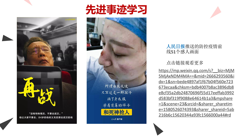 學(xué)習(xí)楷模。在此次新冠病毒防控戰(zhàn)中涌現(xiàn)出了大批的模范人物,他們在前線挑起了疫情防控的大梁,保護(hù)了我們的健康安全。帶領(lǐng)學(xué)生學(xué)習(xí)醫(yī)護(hù)人員、志愿者、建筑工人的事跡,點燃學(xué)生的奮斗報國志向。