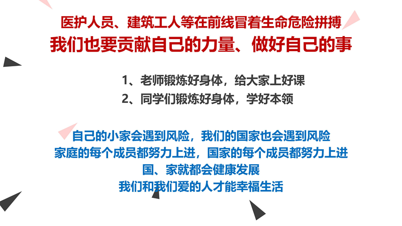 規(guī)劃學(xué)習(xí)。醫(yī)護(hù)人員們在前線冒著生命危險和新冠病毒作斗爭,我們在后方也要做好自己的事,要鍛煉好身體,學(xué)好本領(lǐng),勤奮學(xué)習(xí),鍛煉出可以守衛(wèi)家園的能力。